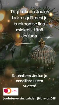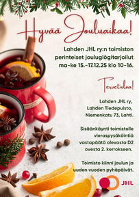Lahden JHL ry:n toimiston perinteiset jouluglögitarjoilut järjestetään ma-ke 15.-17.12.2025 klo 10-16. Paikka: Toimiston tilat, Lahden Tiedepuisto, Niemenkatu 73, Lahti. Sisäänkäynti toimistolle vieraspysäköintiä vastapäätä olevasta D2 ovesta 2.kerrokseen.