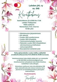 Lahden JHL ry os.048 järjestää sääntömääräisen kevätkokouksen ke 22.4.2026. Kokous pidetään Lahden Tiedepuiston Pöllö auditoriossa klo 17.00, osoitteessa Niemenkatu 73D 5 kerros, 15140 Lahti. Kokoukseen osallisuvan tulee olla yhdistyksen 048 jäsen. Jäsenellä tulee olla mukana voimassa oleva jäsenkortti tai henkilöllisyystodistus jäsenyyden todentamiseksi.