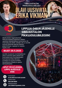 Sibeliustalon pikkujouluissa lavalle nousevat monilahjakkuus Olavi Uusivirta sekä yleisöt niin Suomessa kuin Euroopassakin hurmannut Erika Vikman! Luvassa on suuria tunteita, tanssittavia hittejä ja upeaa tähtisäihkettä!