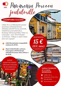 Lähtö La 13.12 Marolankadun turistipysäkiltä Lahdesta klo 9.00 ja paluukyyti lähtee Porvoosta takaisin Lahteen klo 14.00, perillä Lahdessa n. klo 15.00.