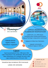 Lahden JHL ry os.048 tarjoaa mahdollisuuden hankkia jäsenhintaisia lippuja Flamingon vesipuistoon etuhintaan!